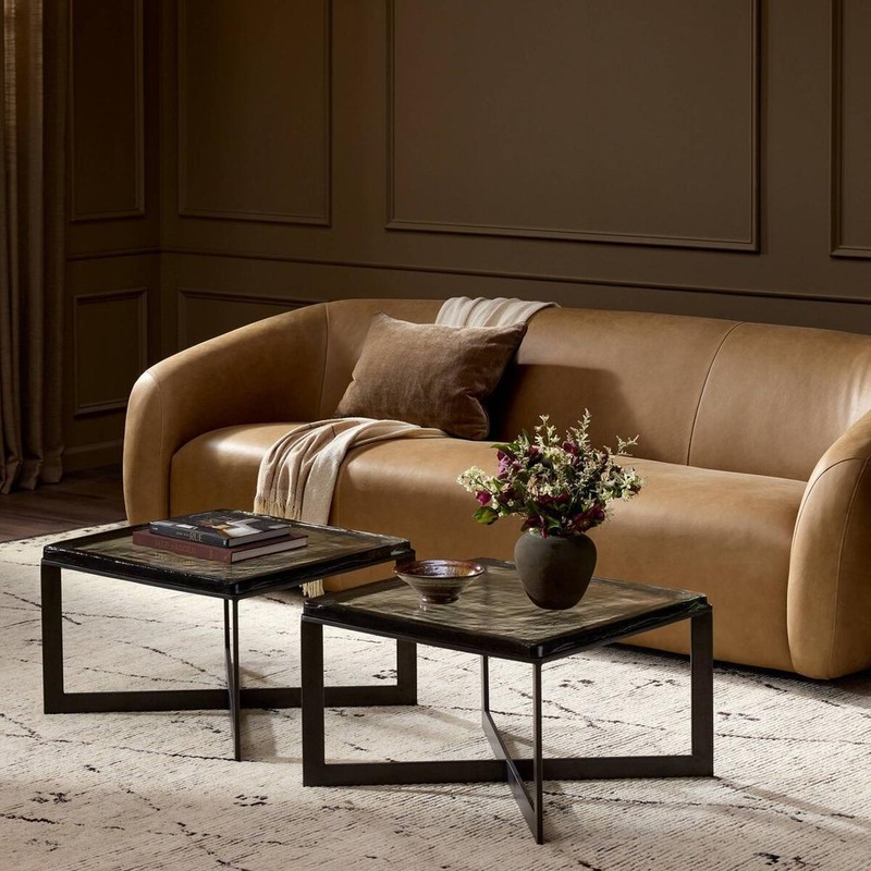 An airy, angular base of charcoal-burnished iron supports a squared tabletop of clear cast glass. Styles well alone or paired in multiples.