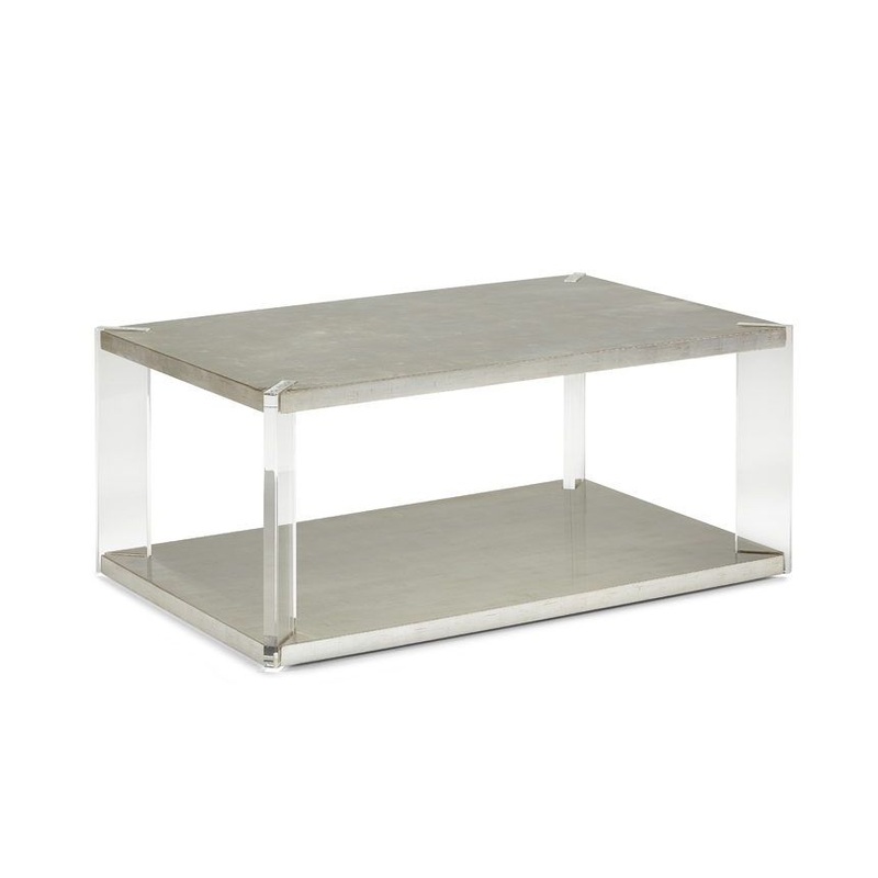 Nicely scaled rectangular cocktail table combining an acacia wood top and base that are finished in a handsome gold leaf with acrylic leg posts that pierce the top and base at the corners and create the farme structure for the table.