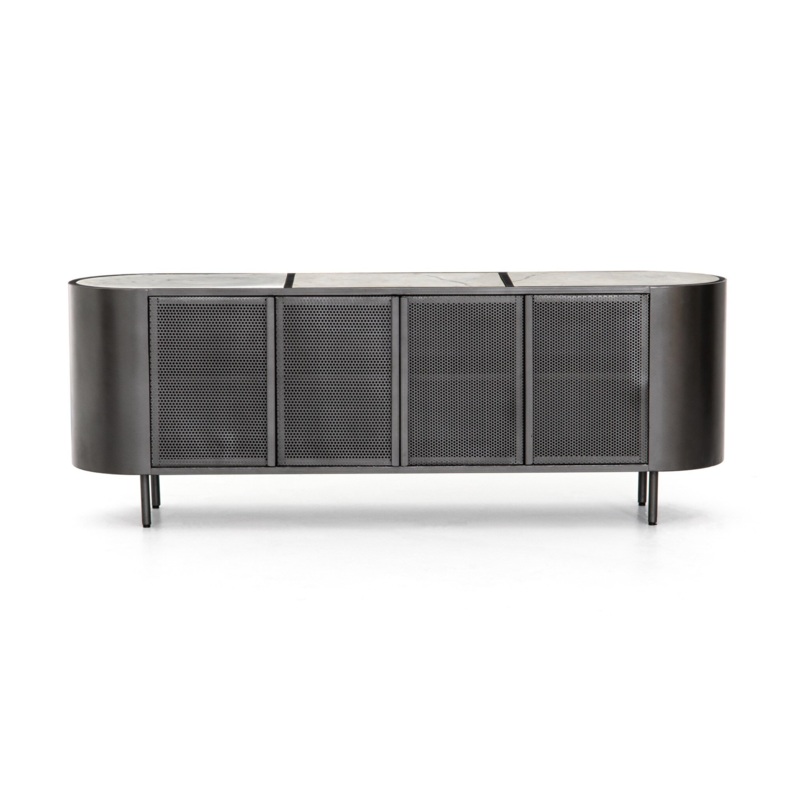 Late-Seventies style gets a modern refresh. Gunmetal-finished iron is perforated and rounded, for an intriguing take on popular pill shaping. A polished white triptych-style marble top adds material interest to this unique piece.