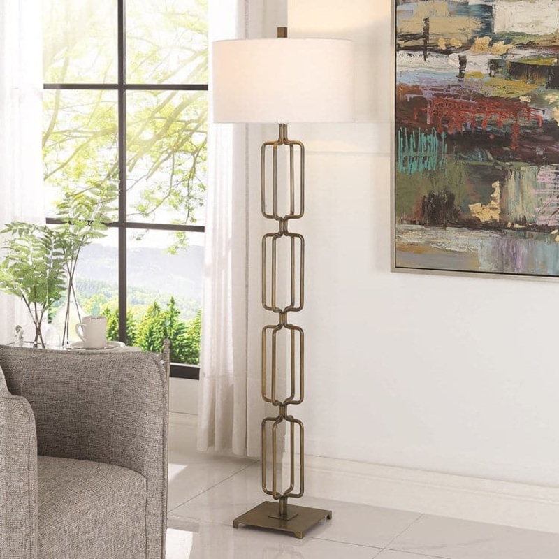 The Link floor lamp features a unique design made from hand forged iron, finished in a heavily antique brushed gold. The hardback drum shade is covered in a white linen fabric.