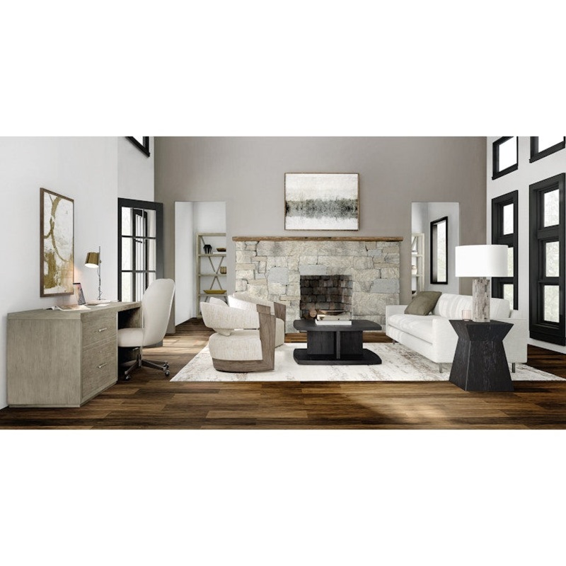 Capturing the essence of natures organic color palette on a clean-lined, simple silhouette, the Linville Falls Desk is crafted of Oak Veneers with a soft smoked gray Mink finish. The 84-inch wide top is flanked on one side by a leg end panel and on the other by a lateral file with a top utility drawer and a lower locking file drawer with pendaflex filing system. The desk is fully finished on the back so it can be floated in a room. Capturing the essence of natures organic color palette and the aura of a rustic mountain cottage, Hooker Furniture introduces the Linville Falls collection. The whole home collection is designed for younger consumers looking for casual and contemporary furniture. Characterized by its rustic, weathered finish and clean lines paired with organic grain patterns, Linville Falls is constructed with split oak solids and veneers and has an overall organic aesthetic. It is featured in a soft Smoked Gray finish mixed with a Charred Black finish that is achieved through Shou Sugi Ban, a Japanese technique that creates an elegant burnt wood look. Its moderate scaling and fresh silhouettes offer a refreshing juxtaposition mixing old with new.