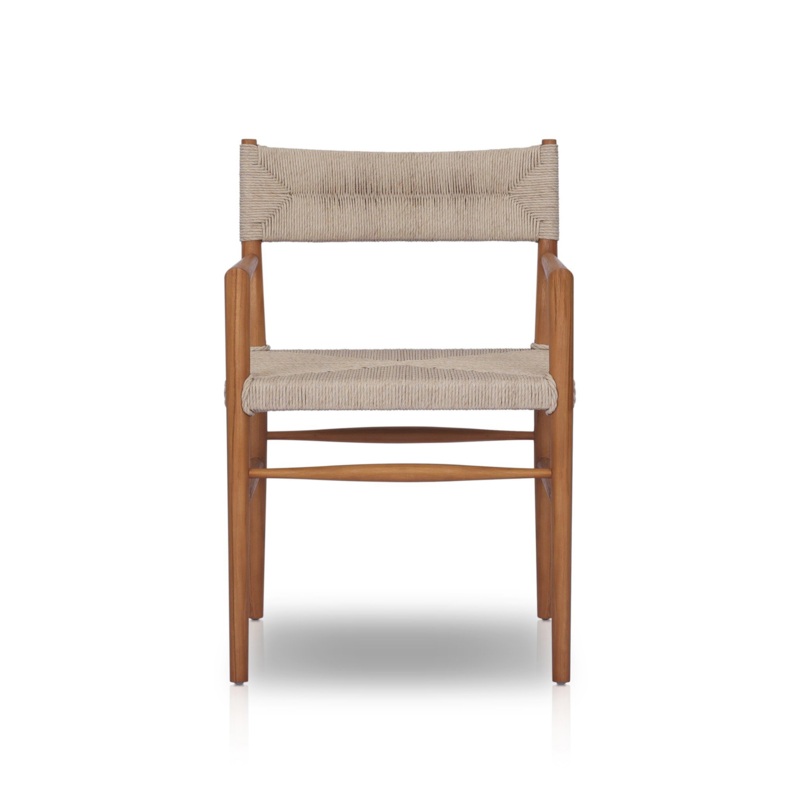 With a beautifully natural finish, slim, tapered teak frames this woven all-weather wicker outdoor dining armchair. Cover or store indoors during inclement weather and when not in use.
