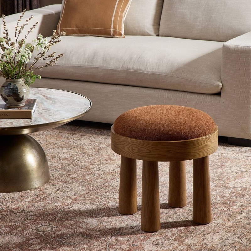 A simple, charming stool with natural oak wood veneer finish and a seat upholstered. Tapered legs add subtle character.