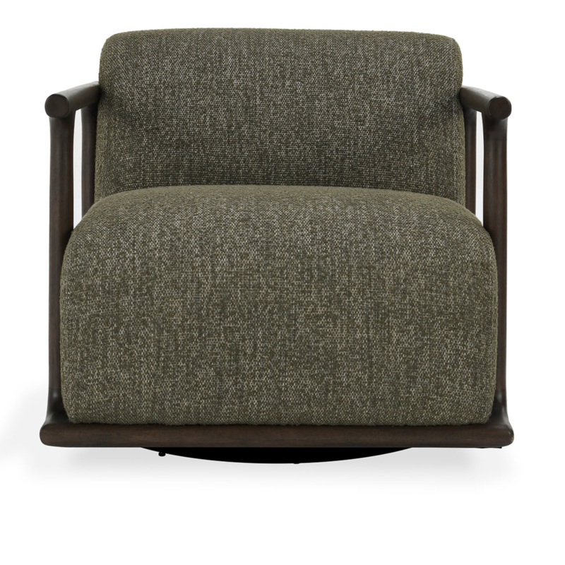 Introducing the Lucia Swivel Accent Chair in Kale Green. Upholstered in a soft boucle fabric for a textured appearance. Made with heavy and scratch-resistant Ash wood, the base accents provide sturdy support. With a full 360 swivel, this chair adds a touch of sophistication to any space. Compliant with the California Technical Bulletin 117-2013 fire safety standard. Its mid-century curved detailing makes it a perfect addition to any luxurious lifestyle.