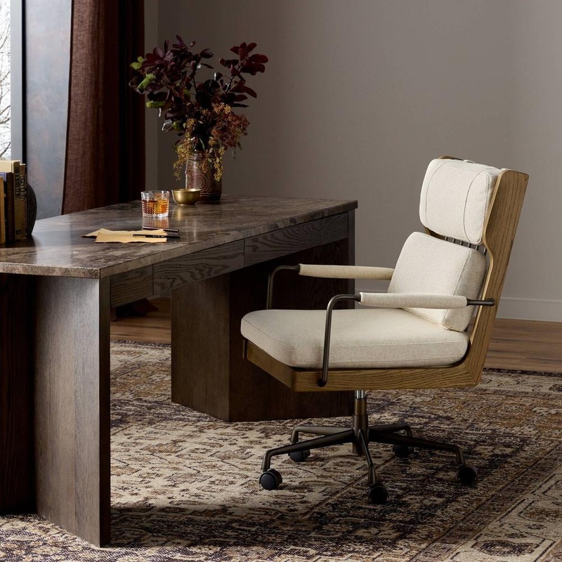 Its all in the details. This detail-driven executive desk chair blends timeless form with modern function, elevating any workspace. A solid aged oak frame is accented with sleek metal back spindles and slightly tapered arms wrapped in either fabric or top-grain leather for a refined touch. An upper cushion with strap-and-snap detailing adds both comfort and character. Upholstered in a performance linen-cotton-poly blend or exclusive black top-grain leather, this chair is designed to withstand daily use with unmatched durability. Steaming required.