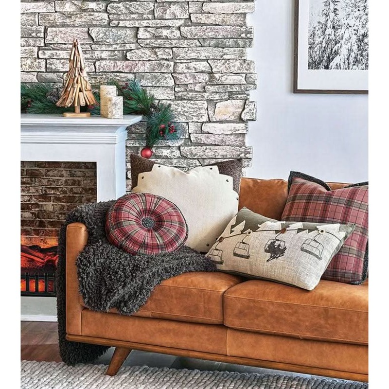 - Button tufted tambourine pillow in 100% cotton red plaid with gray trims