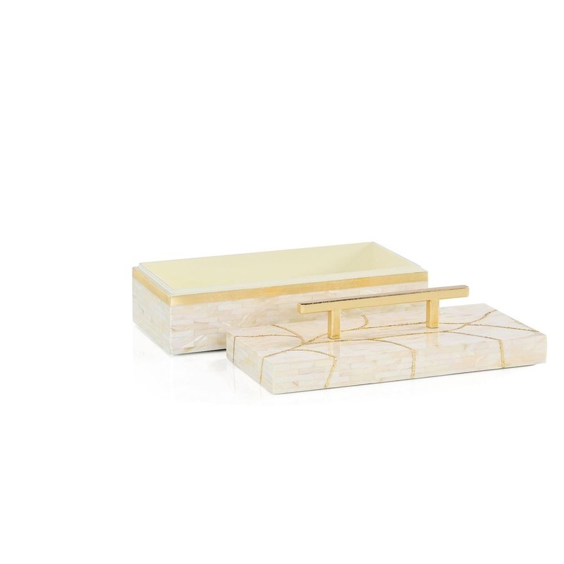 The Luz Box is a gorgeous decorative vessel with a chic contemporary look. Crafted from mother of pearl, the box showcases gorgeous pearlescent tones paired with gold trim and a splintering motif at the top. The look is completed with a slender steel handle in a Brass finish
