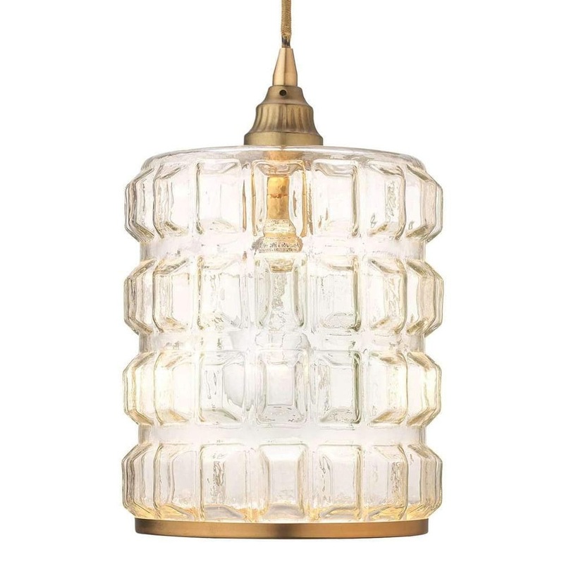 The glass block grid pattern and antique brass accents give it a cool retro Mid Century Modern look.