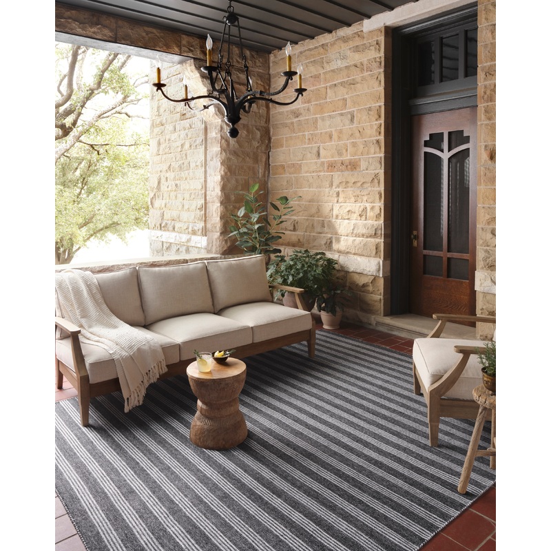 The Charlie Collection by Joanna Gaines x Loloi is an indoor/outdoor area rug with a timeless design inspired by ticking stripes. This easy-to-clean and durably made rug can hold up to high-traffic mudrooms and entryways, or anchor a backyard deck or patio. Charlie is hand-loomed of 100% recycled post-consumer polyester that saves post-consumer plastic bottles from ending up in landfills. This collection is made in India and GoodWeave-certified, ensuring our commitment to ethical production and the support of weavers communities. To clean, hose off and air dry. SPECS: -Pile Height: 0.25 -Fiber: 100% Polyester -Construction: Hand Loomed -Country of Origin: India -Care: Clean spills immediately by blotting with a clean sponge or cloth. Rinse with water from garden hose. Lift off ground to dry thoroughly. Appropriate rug pad is highly recommended on all surfaces to prevent slipping, add cushion, and improve durability. Professional cleaning recommended. For vacuuming, use a vacuum cleaner without beater bar or one where you can set the bar to the highest pile setting. If your vacuum has variable power settings, set on low. Vacuum full length of the rug, turn and repeat to the next area, rather than back and forth motion.