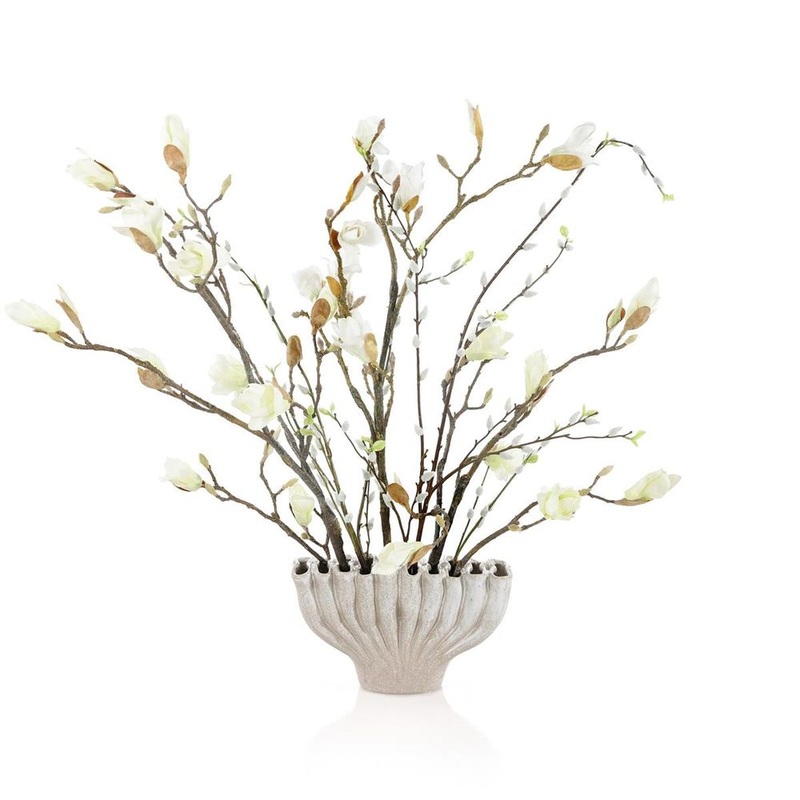 Magnolia Stemis an elegant display of Japanese magnolias and naturally toned pussy willows. This gorgeous arrangement is held within an abstract ceramic pot with a coffee hue, lined with natural reindeer moss.