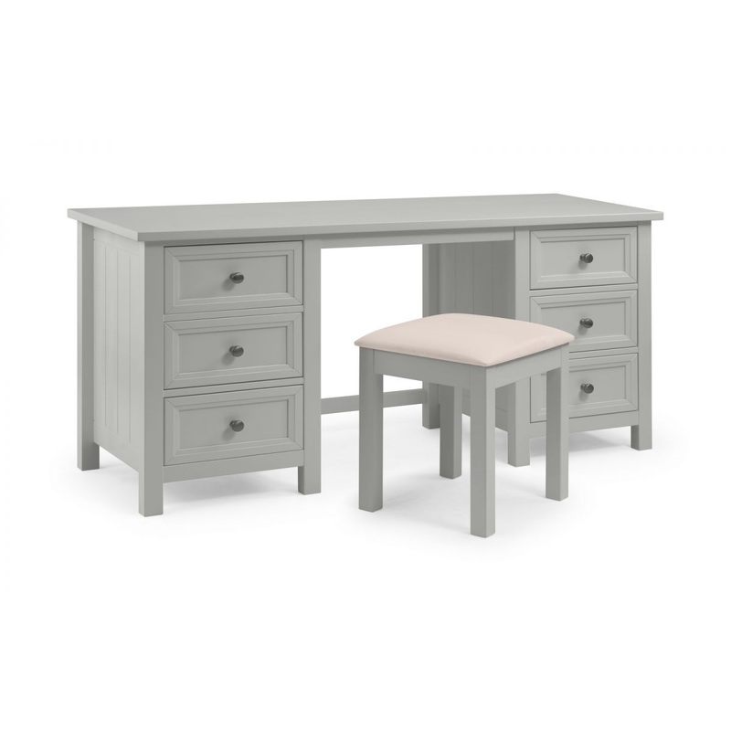 Maine is an elegant New England style range of bedroom furniture. The combination of exquisite dove grey lacquered finish with characteristic side panelling and detailed chamfered cabinetry makes for a soothing and refined aesthetic with timeless appeal, while delicate pewter handles add the perfect finishing touch. The Maine Dressing Tableoffers copious amounts of storage with 6 drawers. The perfect match for the Maine Dressing Stool.