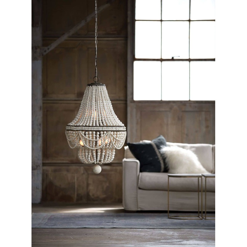 Classic style meets modern charm with this chandelier. A bevy of draped wooden beads in weathered white, dresses up the steel structure, bringing out an earthy glamour to any space.