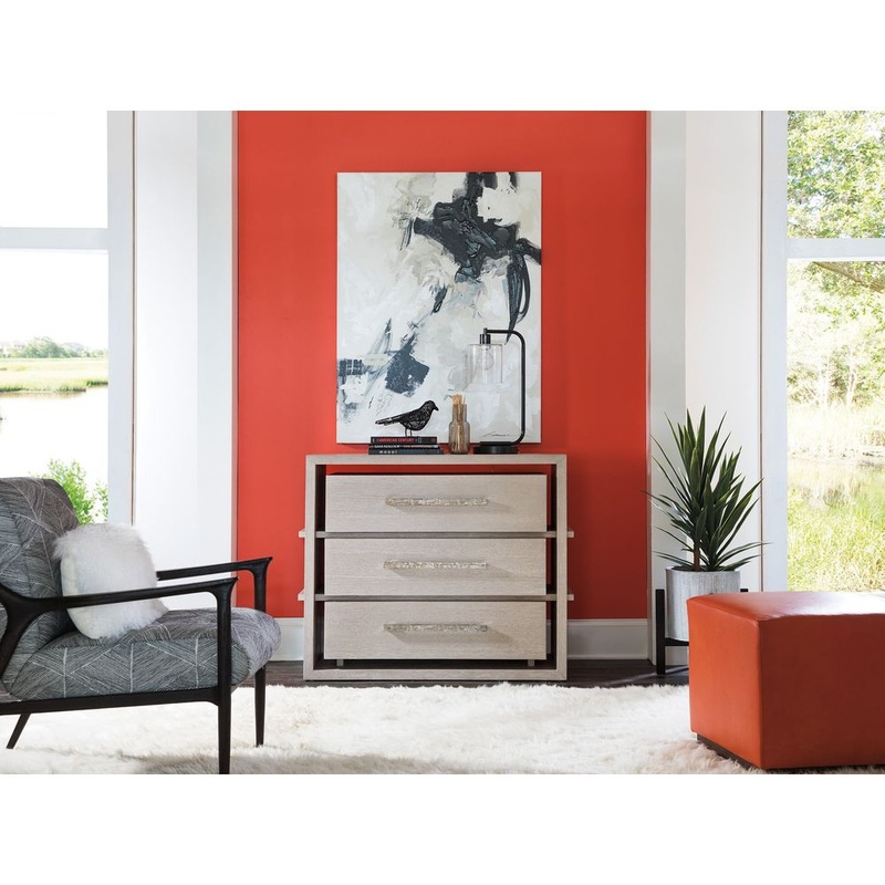 Marketing Copy: Our largest lifestyle collection was conceived to inhabit modern environments in both coastal and mountin settings, featuring original architectural designs dressed in linear quartered white oak veneers in a soft, champagne taupe liimed in an ivory ceruse. Complimentary element include leathered Anticato marble tops, stunning organic hardware in bright nickel, and metalwork clad in a slightly warm silver leaf finish.