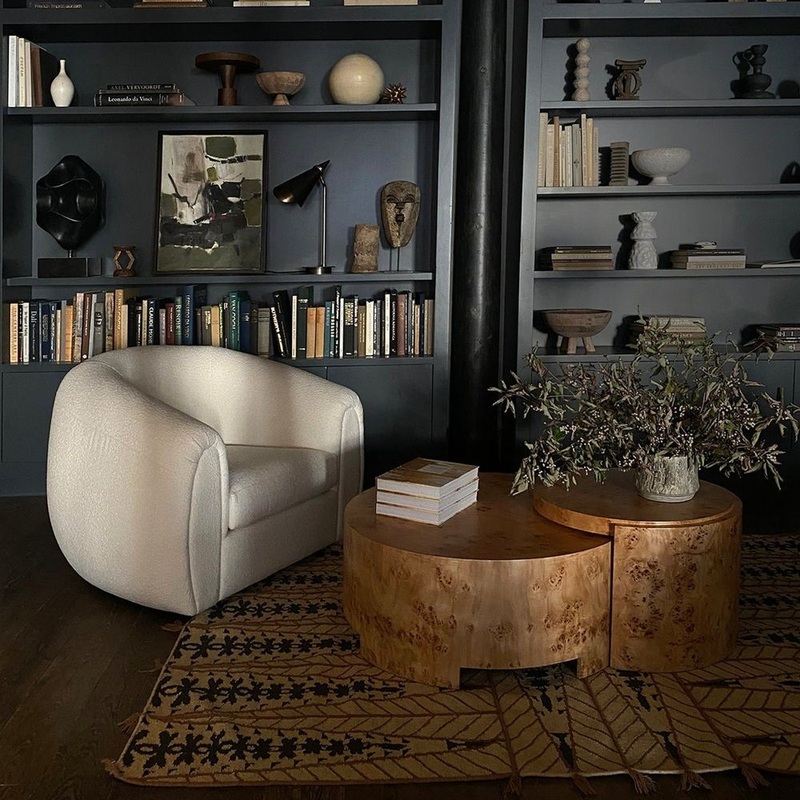Two cylindrical forms make an artful, bunching cocktail table and celebrate the natural Mappa burl wood for a functional addition to any room.