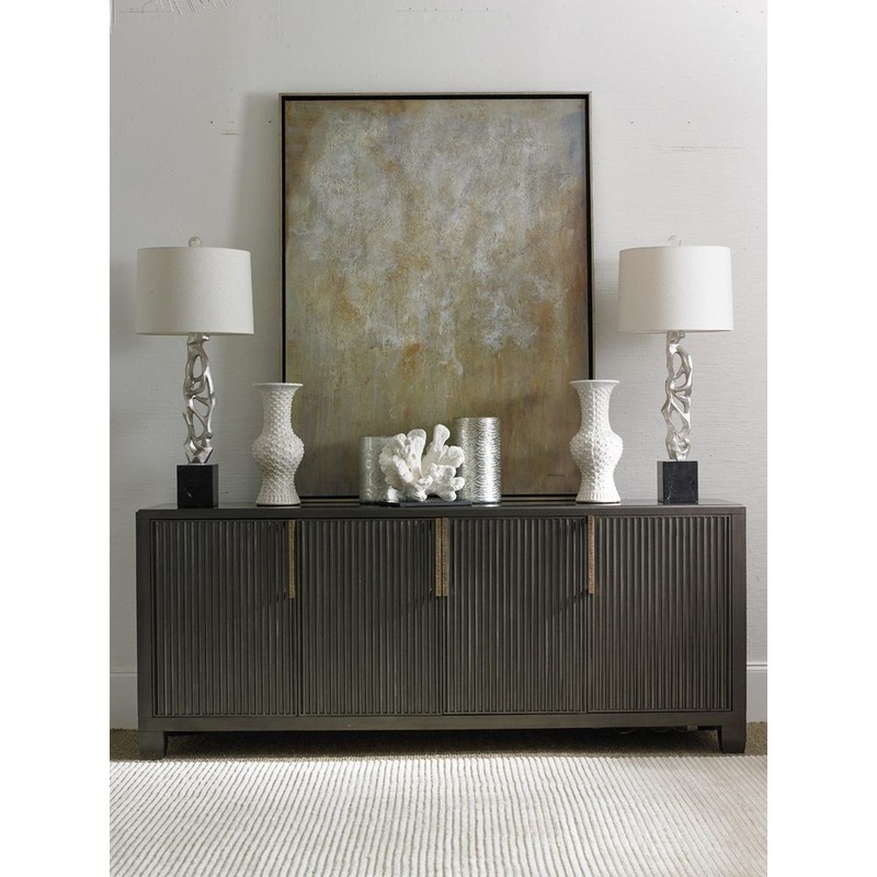 Reeded door credenza offering great scale and lots of storage space. The two center doors house interior drawers with a silver liner as well as an adjustable shelf. The outside left and right doors also have an adjustable shelf within. Textured bar pull hardware is in a champagne gold finish.