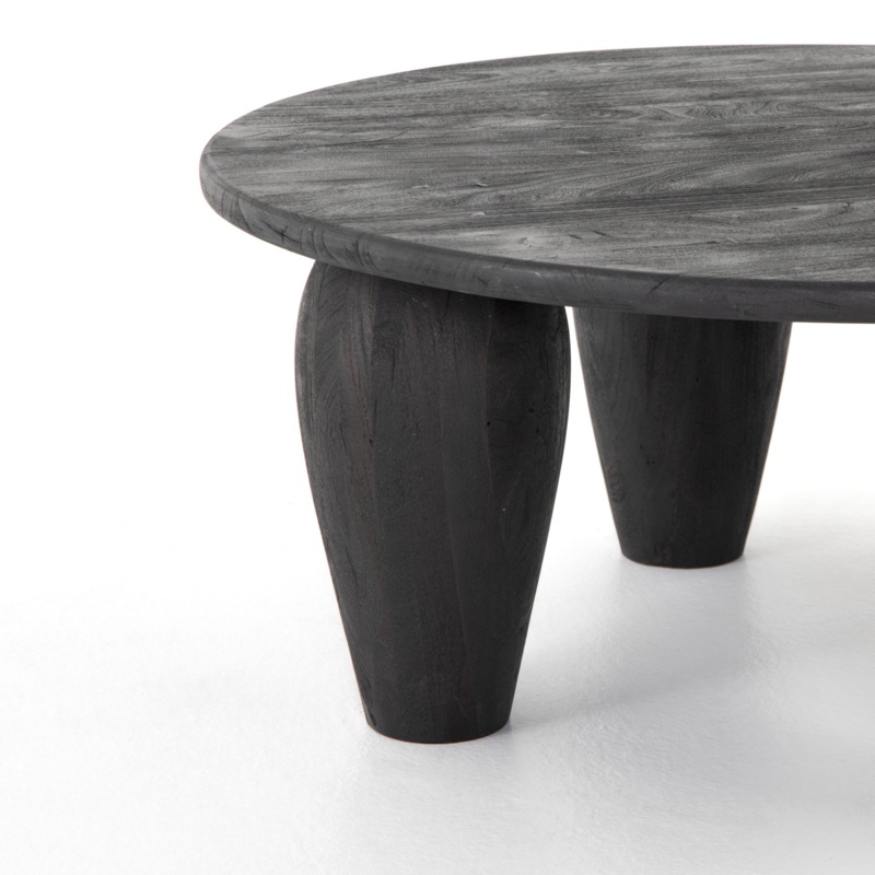 Play up proportions. Shapely, substantial legs support a slim, rounded tabletop of light black-finished reclaimed woods, for a global, organic look and handcrafted vibe.