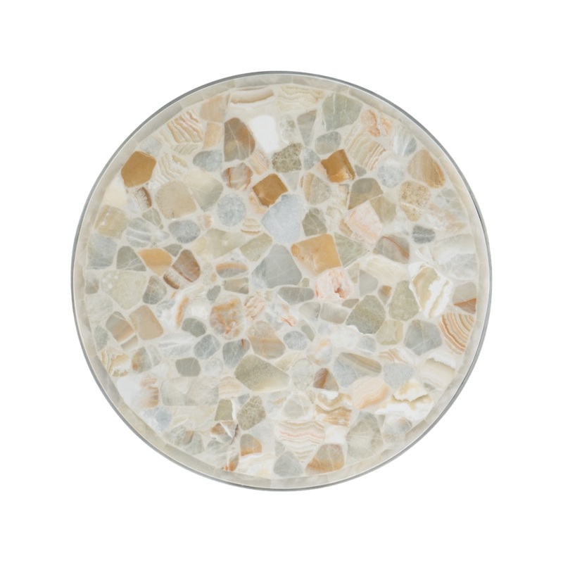 With a convenient 28 x 28-round footprint, the Marin Lamp Table combines Pewter Metal on a geometrically-shaped base with a Tumbled White Onyx top with shades of grays, creams and golds for an eclectic blending of elegant, organic materials in a medley of rich neutrals. Come closer to Melange, and you will discover something unexpected. An eclectic blending of colors, textures, and materials in a vibrant collection of one-of-a-kind artistic pieces, Melange is meant to inspire you and fuel an experience of self discovery, inspiring a renaissance in your home. Each piece of Melange has its own story. The designs are versatile and timeless, easily transcending from one life stage to the next, from home to home and generation to generation.