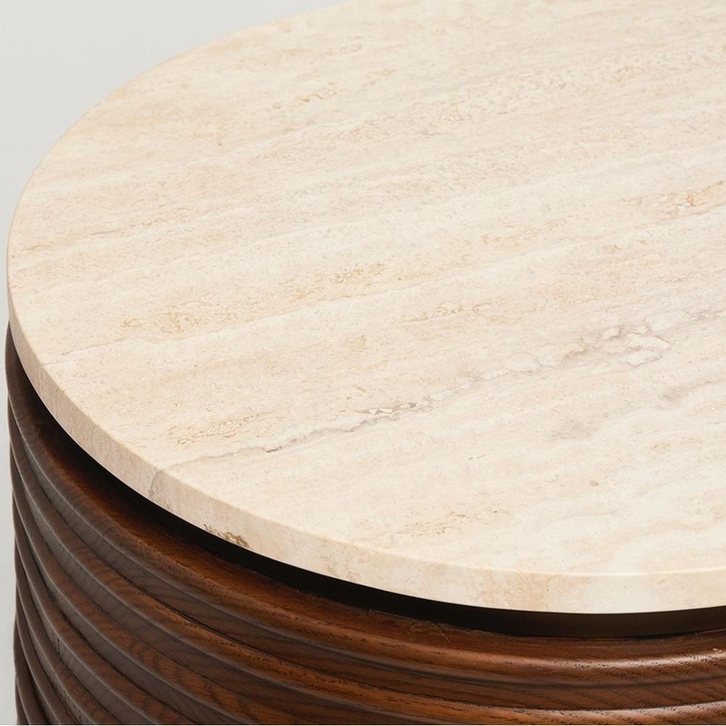 Crafted of oak in a classic walnut finish and topped with raw travertine, the art