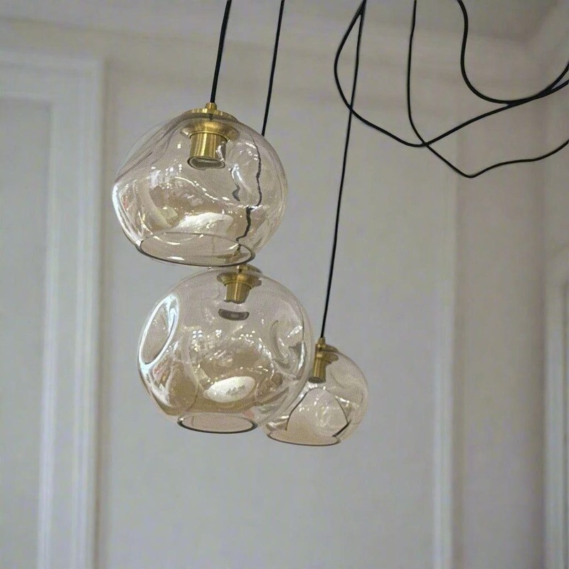The multi-light chandelier truly embodies modern elegance, and its stunning aesthetics can be tailored to suit your distinctive requirements. Whether it graces a kitchen, dining area, hovers above a bed, or adorns a hallway, it guarantees a striking and evocative lighting focal point. This is thanks to the molten glass, which possesses an innate allure due to its handcrafted, organic structure. The inherent diversity in the glass shades results in captivating interplays of light and shadow, particularly when paired with the contemporary elegance of its unconstrained black cords and brass canopies.