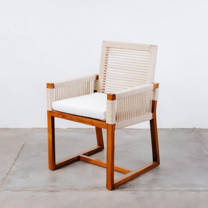 This unique dining chair will look amazing in modern and contemporary style spaces alike. A teak wood frame provides ample support for the rope back and arms. Foam cushioning is upholstered in a neutral beige finish.Available in both side and armchair styles.