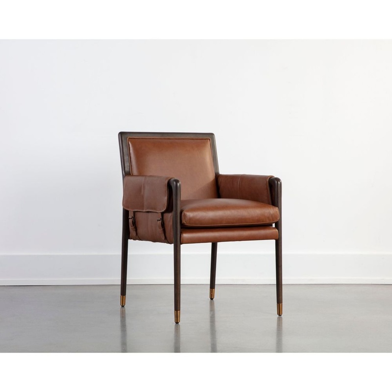 Description: With influence from vintage design, the Mauti Dining Armchair evokes a charming and rustic mid-century appeal. Upholstered in shalimar tobacco leather with dual buckle flap detailing on the armrests. Completed with a brown solid oak wood frame with brushed gold metal foot caps. Handle with Care: This design has been crafted with 100% top grain leather. Leather is a natural material; as such, colour variations, markings, wrinkles, grooves and light scratches are acceptable and appreciated characteristics. No two pieces are alike. Visit our Product Care page for more information on how to ensure the lasting beauty of this piece. As wood is an organic, porous material, these pieces will contain natural variation of texture and may also exhibit fine indentations and cracks. Wood pieces will also display a disparity of colour and grain, and visible knots and burls that add to the character of each piece.