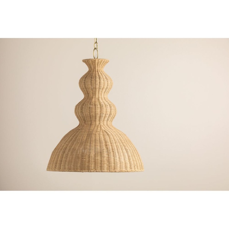 Description: Inspired by the movement of rippling water, the shapely silhouette of Mayla blends craftsmanship with a coastal touch. Light filters softly through the woven rattan wicker shade, which comes in two sizes. Suspended by an Aged Brass chain, this pendant makes for an eye-catching addition to living and dining rooms. Part of our Megan Molten x Mitzi Tastemakers collection. *Due to the one-of-a-kind nature of the medium, exact colors and patterns may vary slightly from the image shown.