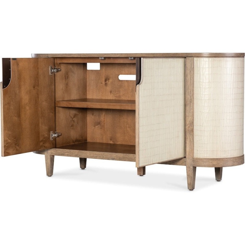Crisp and current like fashion apparel, the Mlange Arbor Credenza has a two-tone neutral color palette combining Oak Veneers in a medium wood finish on the frame, top and legs with a contrasting canvas crackle in a parchment color on the doors and sides. The two doors have soft-close hinges and magnetic door catches. One adjustable shelf behind the doors. Come closer to Melange, and you will discover something unexpected, an eclectic blending of colors, textures and materials in a vibrant collection of one-of-a-kind artistic pieces.