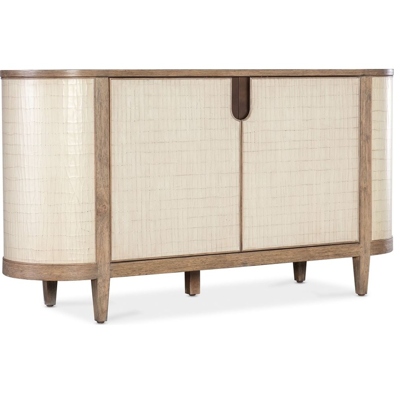Description: Crisp and current like fashion apparel, the Melange Arbor Credenza has a two-tone neutral color palette combining Oak Veneers in a medium wood finish on the frame, top and legs with a contrasting canvas crackle in a parchment color on the doors and sides. The two doors have soft-close hinges and magnetic door catches. One adjustable shelf behind the doors.