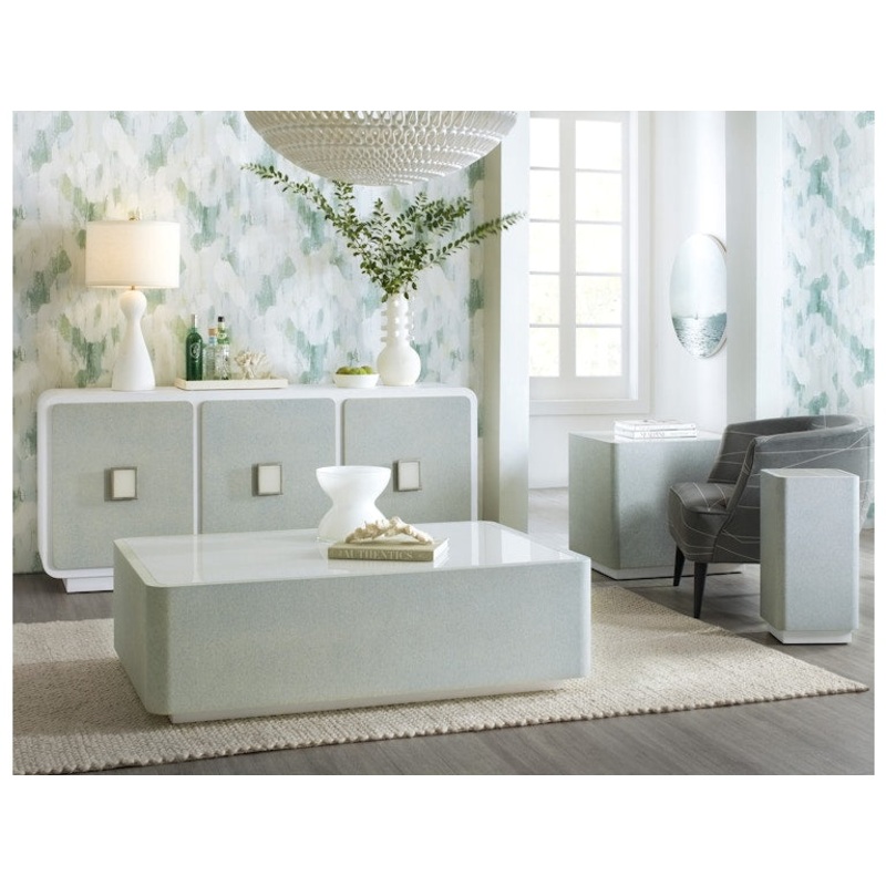 Serene and stylish with a spa-like color scheme, the modern Atlantis Entertainment Credenza has rounded corners on a rectangle shape, raffia-wrapped door fronts and a creamy white plinth base, sides and front. Dramatic square-shaped hardware is silver-colored metal with white painted glass. The three doors have soft-close hinges and magnetic door catches with one adjustable shelf behind each door, a ventilated back panel and a three-plug electrical outlet behind the middle door. The pale blue tone of the raffia-wrapped doors is inspired by Caribbean beaches. Come closer to Melange, and you will discover something unexpected, an eclectic blending of colors, textures and materials in a vibrant collection of one-of-a-kind artistic pieces.