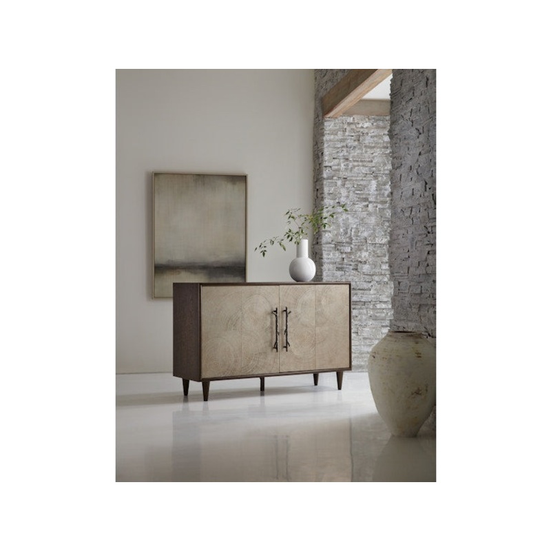 Natural elegance exudes from the Brennon Accent Chest with silver-colored wood veneers on the door fronts in a textured design simulating tree trunk rings. The twig-like hardware is the final organic touch. Two doors with soft-close hinges and one adjustable shelf behind each door, along with a ventilated back panel. Crafted of Tamo Ash Veneer Inlays with Crosscut White Oak Veneers. Come closer to Melange, and you will discover something unexpected, an eclectic blending of colors, textures and materials in a vibrant collection of one-of-a-kind artistic pieces.