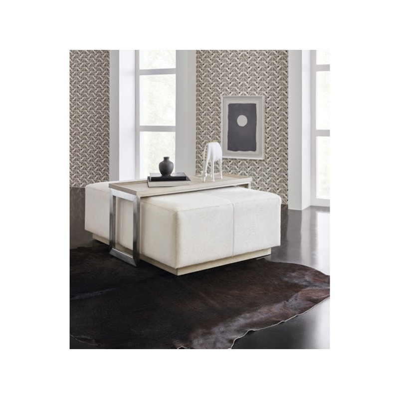 In a user-friendly modern design, the rectangle-shaped Bridged Cocktail Table is upholstered in cream-colored hair-on-hide leather and features a convenient mobile tray top for keeping beverages, snacks or electronics within reach. The tray-top legs are metal-wrapped with a light-finished wood top that matches the wood plinth base. Come closer to Melange, and you will discover something unexpected, an eclectic blending of colors, textures and materials in a vibrant collection of one-of-a-kind artistic pieces.