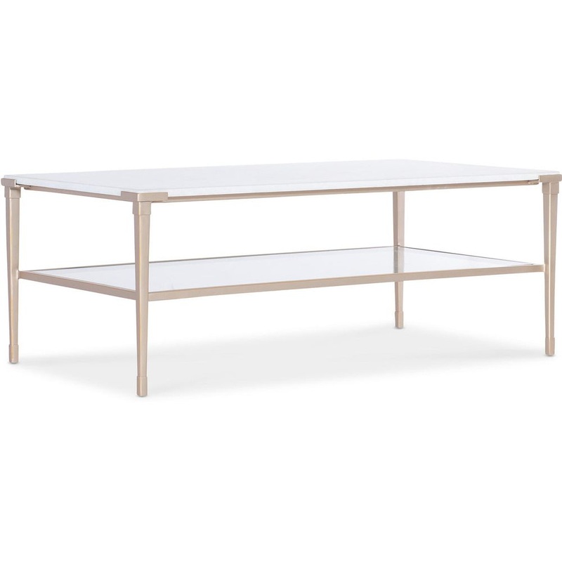 Elevate your living room with the sophisticated Jen Cocktail Table from the Melange collection. Featuring a rectangular white stone top, slim champagne metal legs, and a lower glass shelf, this cocktail table combines style and utility. The open design and refined materials make it an ideal centerpiece for transitional or contemporary spaces, perfect for hosting or displaying decor. Come closer to Melange, and you will discover something unexpected, something far more than an accent furniture collection offering a multitude of finishes. An eclectic blending of colors, textures and materials in a vibrant collection of one-of-a-kind artistic pieces, Melange is meant to inspire you and fuel an experience of self-discovery. Melange can provide that spark needed to begin the transformation of a room and a renaissance in your life. Each piece of Melange has its own story. The designs are versatile and timeless, easily transcending from one life stage to the next, from home to home and generation to generation.