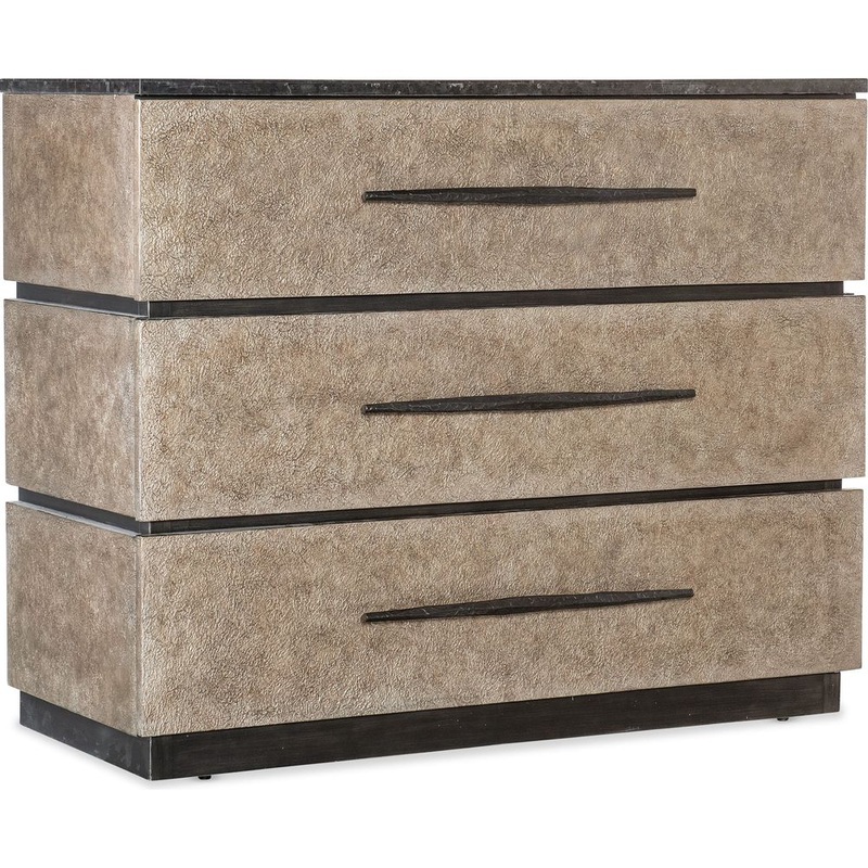 Description: Tactile texture, organic materials and a classic black and taupe color scheme come together in the youthful yet timeless Melange Stacked Chest. Crafted of Maple Veneers with taupe brown drawer fronts, the chest has a polished black marble top, black custom bar pulls and a black plinth base.