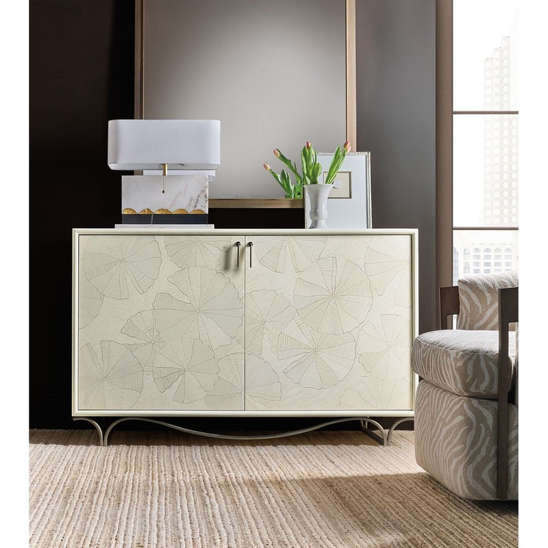 An ode to organic elegance, this chest showcases intricate lily pad marquetry over a soft white painted finish. With inner storage and a leafed metal base, it brings an artisan-crafted focal point to refined spaces. Come closer to Melange, and you will discover something unexpected, something far more than an accent furniture collection offering a multitude of finishes. An eclectic blending of colors, textures and materials in a vibrant collection of one-of-a-kind artistic pieces, Melange is meant to inspire you and fuel an experience of self-discovery. Melange can provide that spark needed to begin the transformation of a room and a renaissance in your life. Each piece of Melange has its own story. The designs are versatile and timeless, easily transcending from one life stage to the next, from home to home and generation to generation.