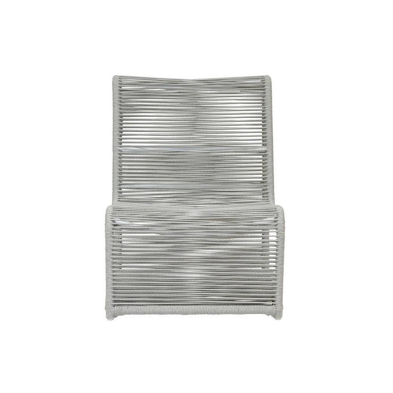 Description: The Miami Armless Club Chair steps outside of traditional outdoor furniture design boundaries to deliver a winning combination of both whimsy and refinement. Featuring an open frame, The Miami is engineered for equal parts comfort and style: the striking silhouette is crafted with thoughtful curves and a premium olefin rope design to provide ultimate support and statement. Fully welded, powder coated aluminum frame Wrapped in weather-resistant, colorfast outdoor rope in Frost Non-marking plastic glides Commercial Quality Construction Miami is a part of the Frost color story, and coordinates well with the Newport Collection and Carrara tables from the Bazaar.