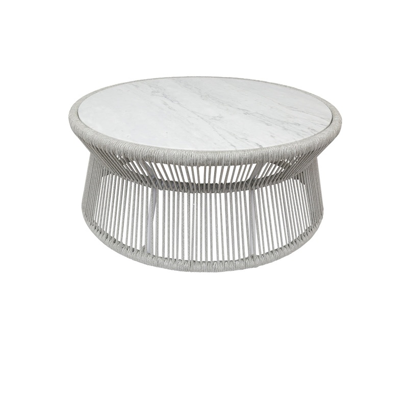 The Miami Coffee table delivers a winning combination of both whimsy and refinement, with striated rope design and hourglass frame. This table features a honed natural Carrara marble top, and round aluminum base wrapped in premium olefin rope in frost.