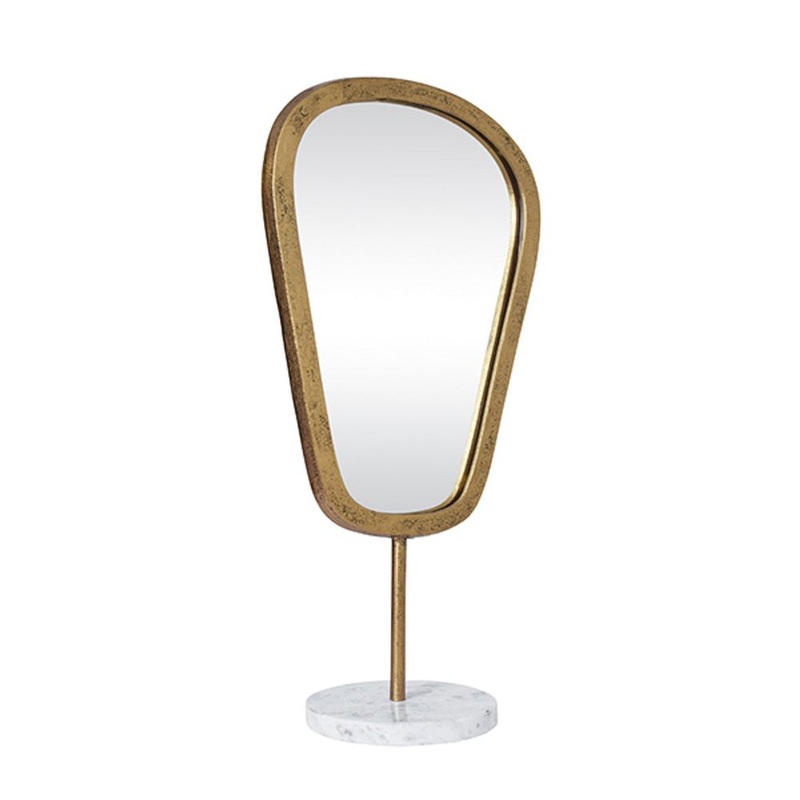 Description: SMALL TABLE TOP MIRROR IN AGED GOLD FINISH ON WHITE MARBLE BASE