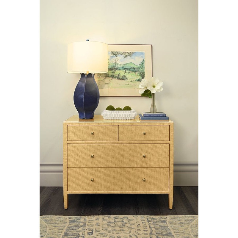 Description: FOUR DRAWER CHEST IN NATURAL GRASSCLOTH WITH GLASS TOP34″H X 42″W X 18″D**Grass cloth has natural variations and may differ slightly between panels.