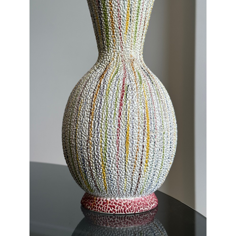 This mid-century hand-painted ceramic vase features a vibrant multicoloured pattern and an elegant curved silhouette. The surface texture and vertical color bands create a playful yet sophisticated aesthetic, making it a striking decorative statement piece.