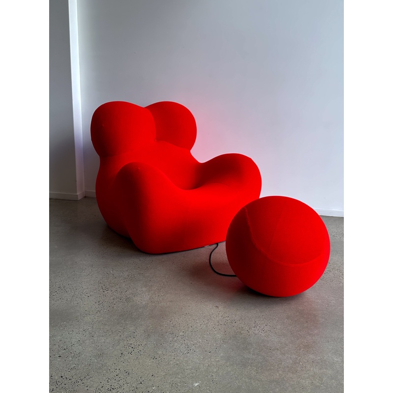 The voluptuous armchair and spherical ottoman, connected by a cord, create a striking visual statement. Pesce envisioned the form as an abstract female silhouette shackled to a ball and chainan enduring metaphor for womens oppression. Whether read as a social critique or a daring sculptural form, the piece challenges conventions while embodying the bold experimentation of the late 1960s.