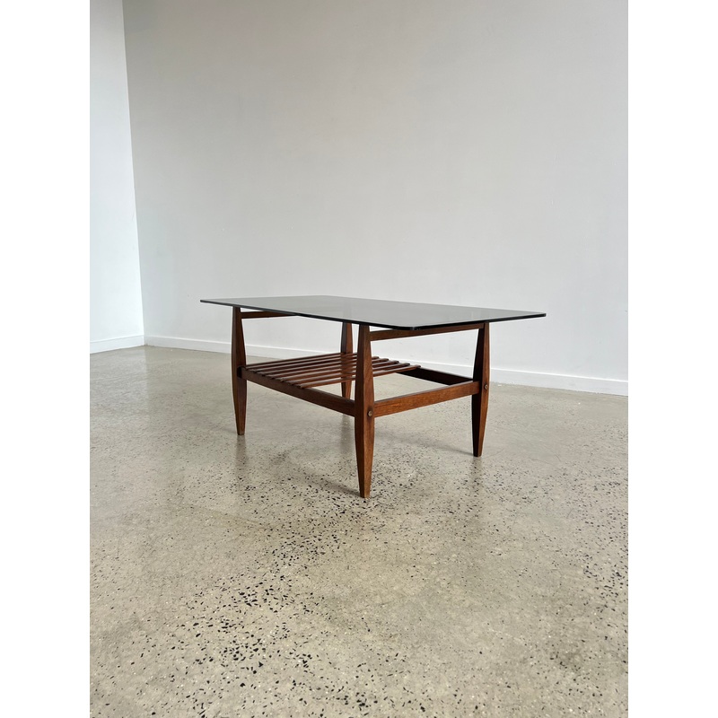 Rectangular shaped Mid Century Modern Italian smoked glass and teak base Coffee table.Italy 1960s.