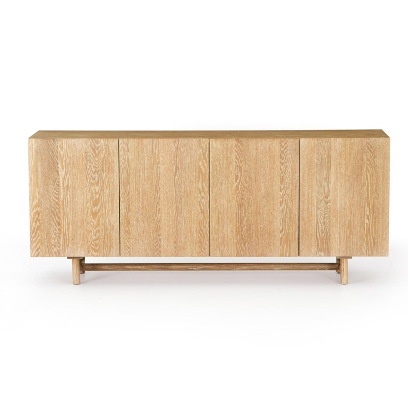 Rustic goes modern. A low stretcher and beautifully grained matte finish brings architectural interest to this simply styled sideboard of white-washed oak.