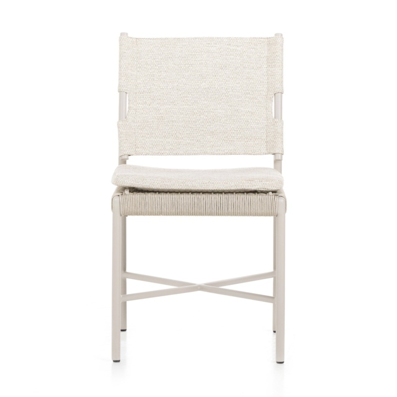 Make a beautifully monochromatic statement, indoors or out. Finished in a light taupe, slim, airy aluminum frames all-weather wicker seating with a top cushion for added comfort. Cover or store indoors during inclement weather and when not in use.