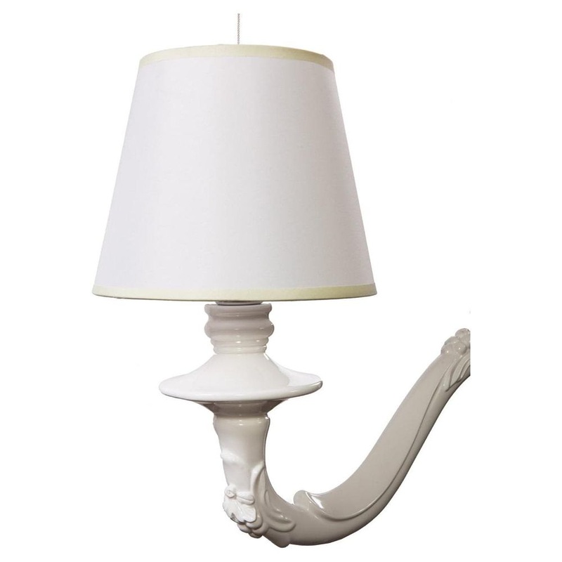 The Phantasm Pendant Light floats luxuriously in space. This post modern take on a traditional lighting fixture takes a single arm of a chandelier and isolates it to hover like a phantom. The brilliant white shade and white resin arm can be easily positioned to fit your space and taste. One 40 watt candelabra bulb underneath the shade will provide diffused ambient lighting.