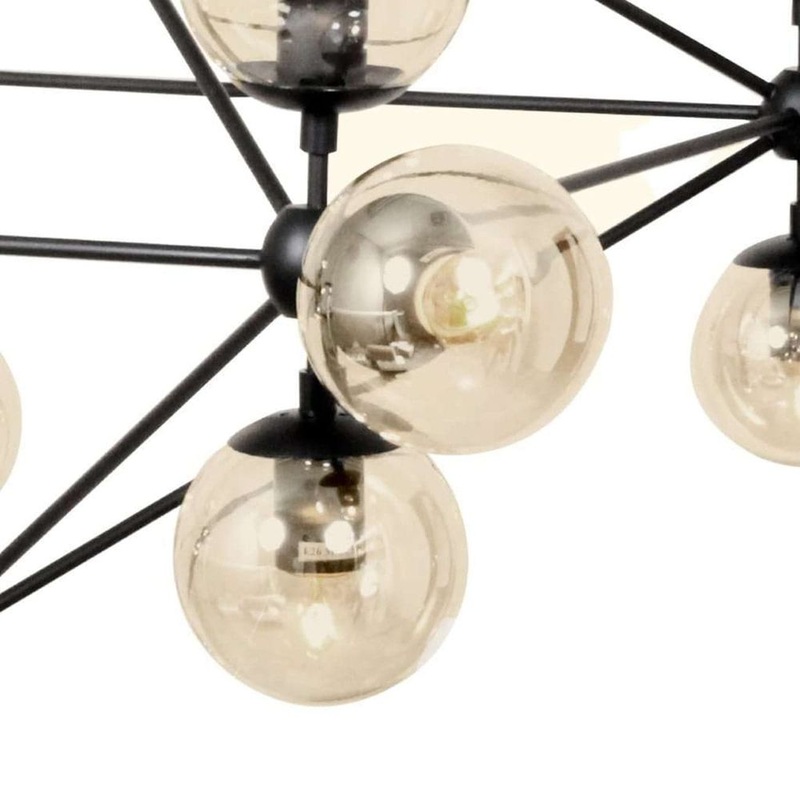 Uniquely bold and geometric this chandelier will be an eye-catching centerpiece in any room. The slender metal rods lay out the symmetrical framework around which the delicate glass spheres cluster. The fifteen tinted shades soften the light of the standard 5 watt bulbs within to create a wonderful glow that will fill your space.