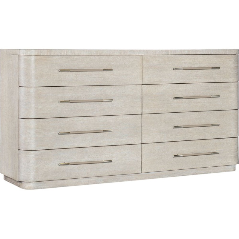 Description: Softly sophisticated with a clean modern profile and luxe mixture of materials, the Modern Mood Dresser is a stunning statement piece. The case has rounded corners and a plinth base and offers 8 self-closing drawers. The top two drawers have drop-in felt liners, there’s a removable jewelry tray in the top right drawer and the bottom two drawers are cedar-lined. Crafted of Oak Veneers, the dresser is finished in the serene Diamond color and accented by metal pulls wrapped in leather.