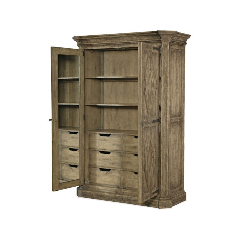 Raised diamond motifs on the case front of the Mt. Maria Wardrobe, accented by vintage-like latch hardware and hinges on the doors, exude the grandeur of the Hill Country region of Texas. Crafted of Poplar and Hardwood Solids with Pecky Hickory Veneer, the Mt. Maria is finished in Barnwood, a multi-tone brown emulating reclaimed wood. Two doors, with a mirror inside both doors. Six drawers and two adjustable shelves and a removable clothing rod Taking the next step in creating a Hill Country family of collections, Hooker Furniture has introduced LaGrange. The anthology of bedroom, living room, dining room, occasional and home office furniture is inspired by the Hill Country region of Texas, including the town of LaGrange, one of the stops made by the Hooker Furniture design team in search of inspiration. The collection includes heavily distressed oak and hickory surfaces, extensive carving and scroll work, aged metals, sedimentary stone and primitive textiles. Each piece has a unique story to tell, while still retaining the authentic American character of the original collection. LaGrange is updated with a fresh new personality, brought to life by four distinctive finishes and modern conveniences for the lifestyles of today.