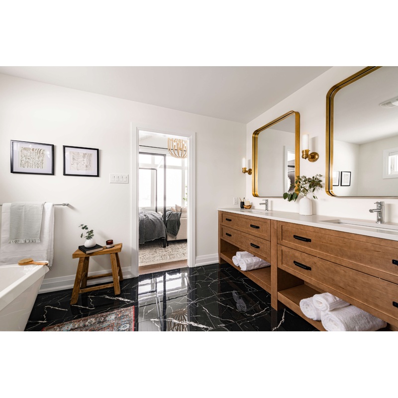 The Mukan Mirror is modern and sleek with rounded corners and depth. The recessed iron frame is powder-coated in a gold finish. Perfect for bathrooms, dining rooms, and bedroom designs.