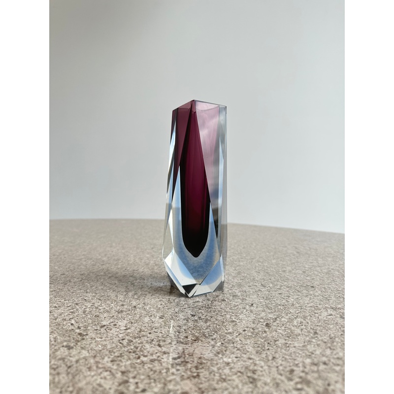 The faceted geometric silhouette enhances the vases visual play of color and light. The inner violet core appears suspended within clear glass, producing a sculptural depth that shifts with every angle a testament to the handblown artistry and innovation of Muranos mid-century era.