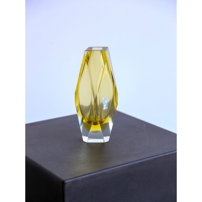 The clear and amber-yellow layers create a luminous optical play, capturing and refracting light through the vases faceted form. The result is both sculptural and functional a perfect reflection of Muranos mid-century artistry and innovation.
